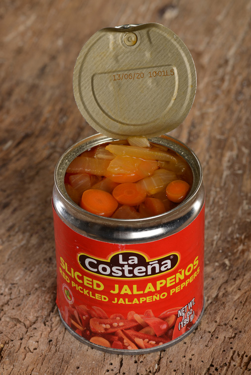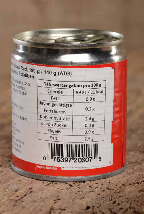 Inhalt: 199g Rote Jalapeno Chillis, geschnitten, Wasser, Essig, Karotten, Zwiebeln, Jodsalz, Sojaöl, Gewürze.