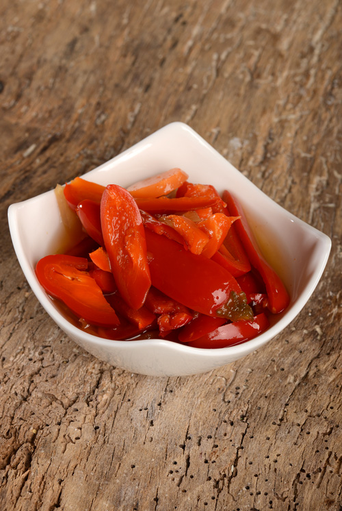 Vollreif geerntete, rote Jalapenos. In Scheiben und mariniert in Essig, Gewürzen, Gemüse -als Konserve. Jalapenos gelten als Einstiegschillies, sie sind sehr aromatisch, dickfleischig und mittelscharf. Für die untrainierte deutsche Zunge bedeutet das, man dosiere für den Anfang zurückhaltend zwei bis drei Scheibchen pro Geniesser. Nachgeschärft werden kann immernoch- denn das individuelle Schärfeempfinden ist sehr unterschiedlich ausgeprägt.